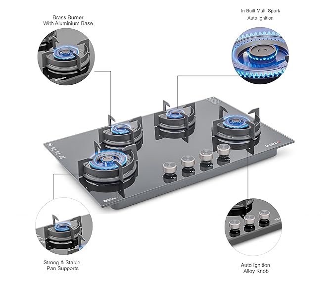 Sujata Hob Gas Stove 4 Burners Glass Top | 5 Years Warranty | 4 Burner Gas Stove Glass Top Auto Ignition, CookTop cum Hob Top, LPG & PNG Compatible, Brass Burner (Indium Auto Ignition - Black)